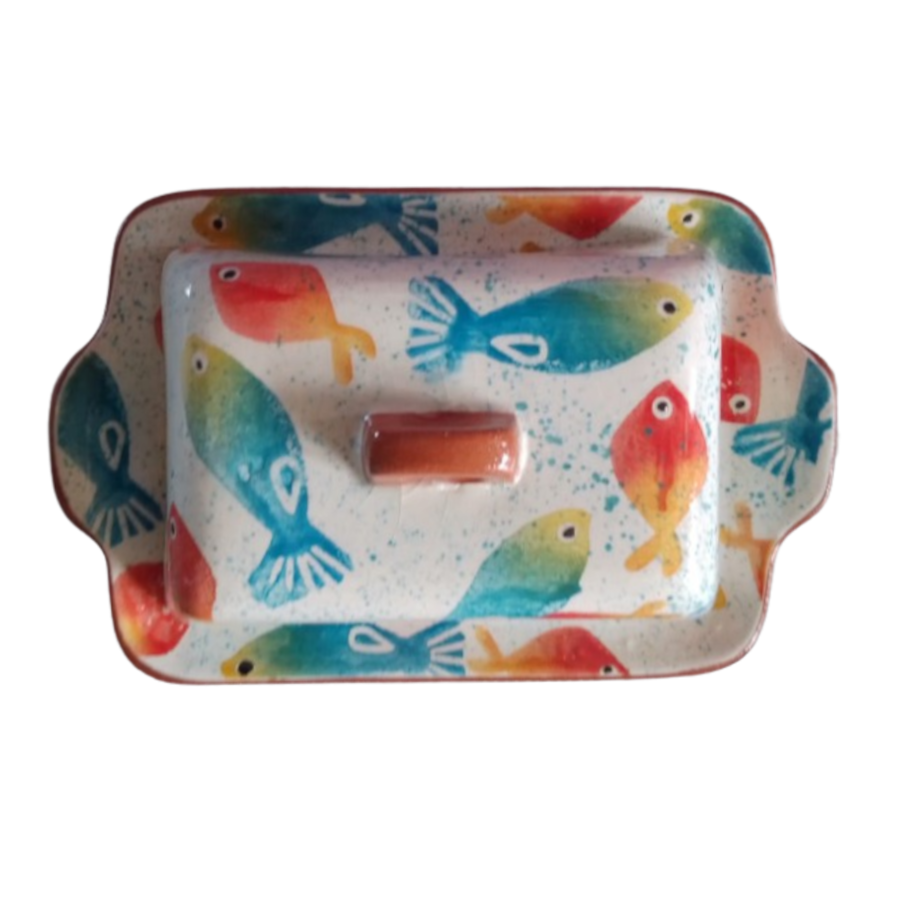 Manteigueira em cerâmica pintada à mão decoração peixinhos(52)
