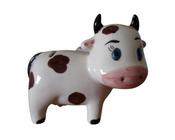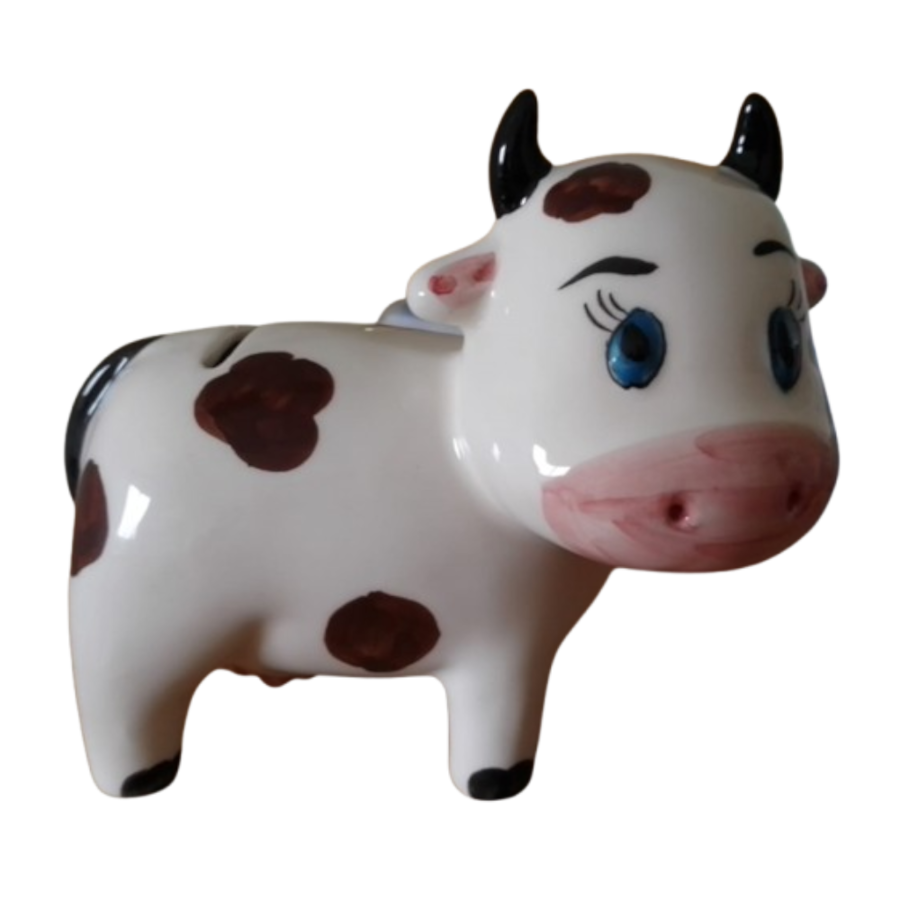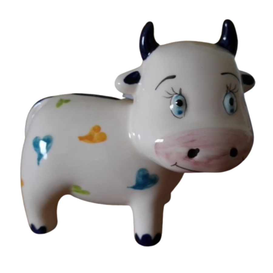 Vaquinha mealheiro em cerâmica pintada à mão, disponível em várias decorações, selecione o pretendido: